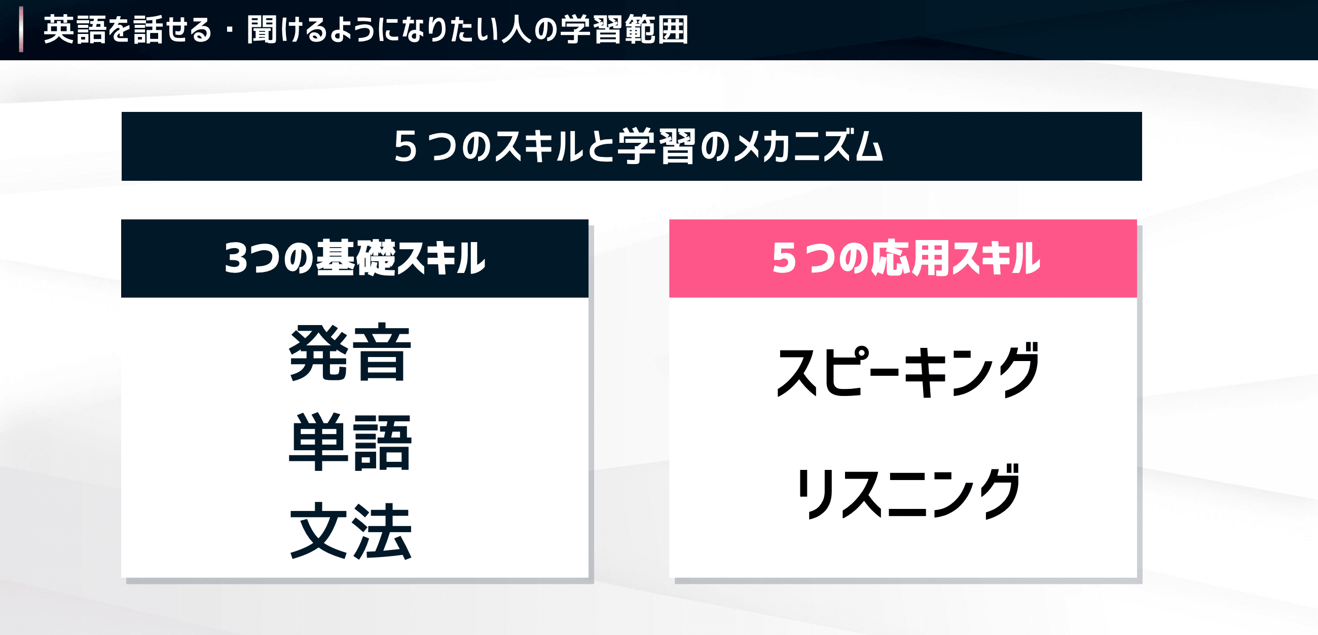 ここまでの内容を踏まえて、ここからは「3つの基礎スキル(発音・単語・文法)」が、どのように応用スキル(スピーキング・リスニング)とつながっているのかについて、具体的に解説していきます。