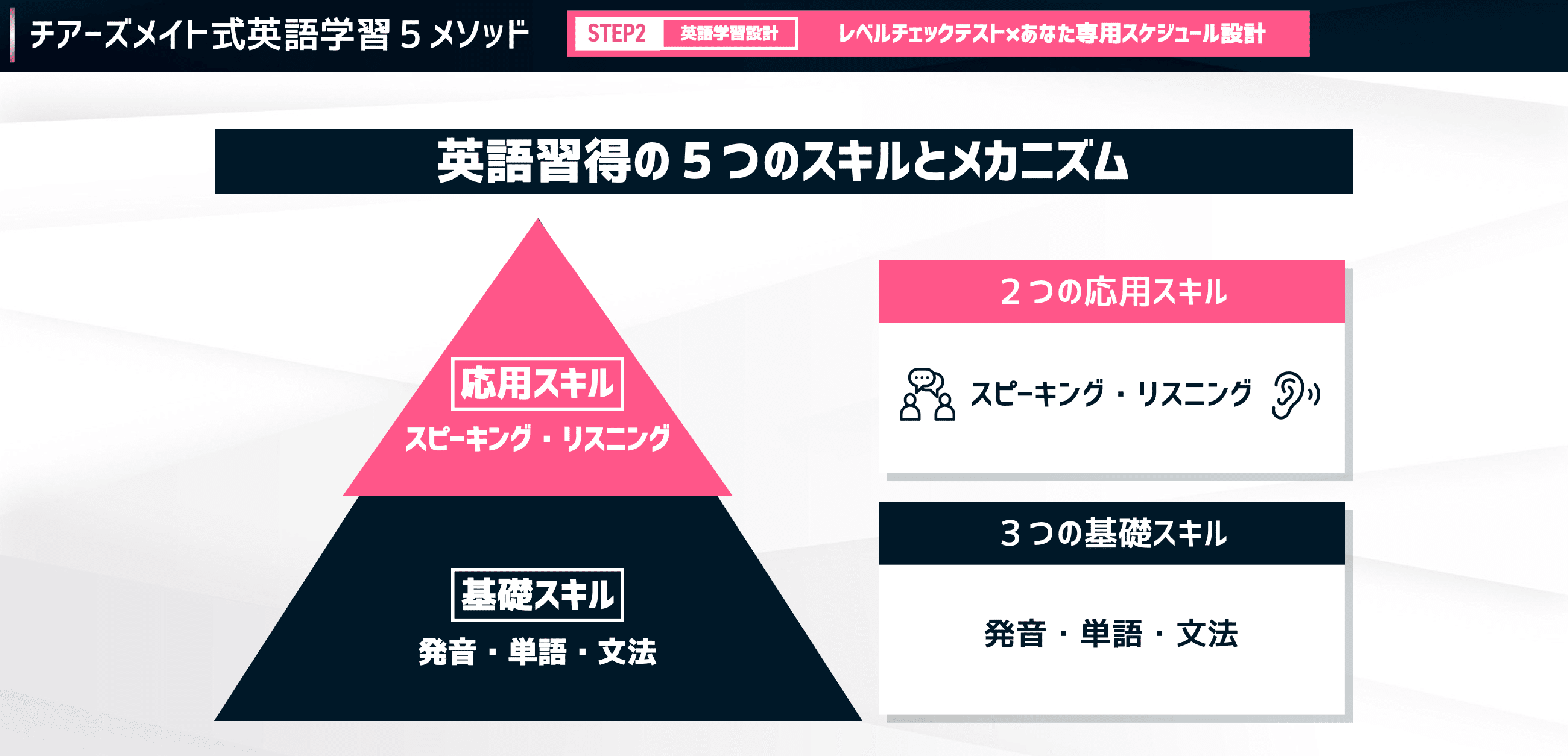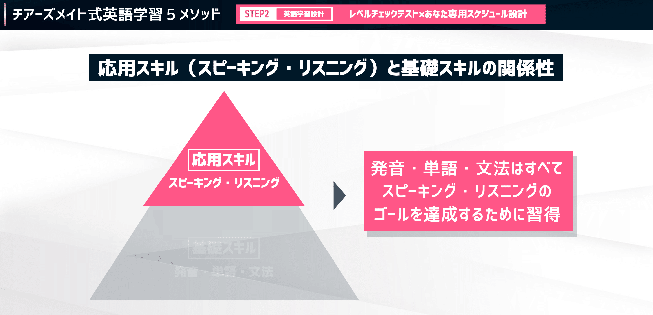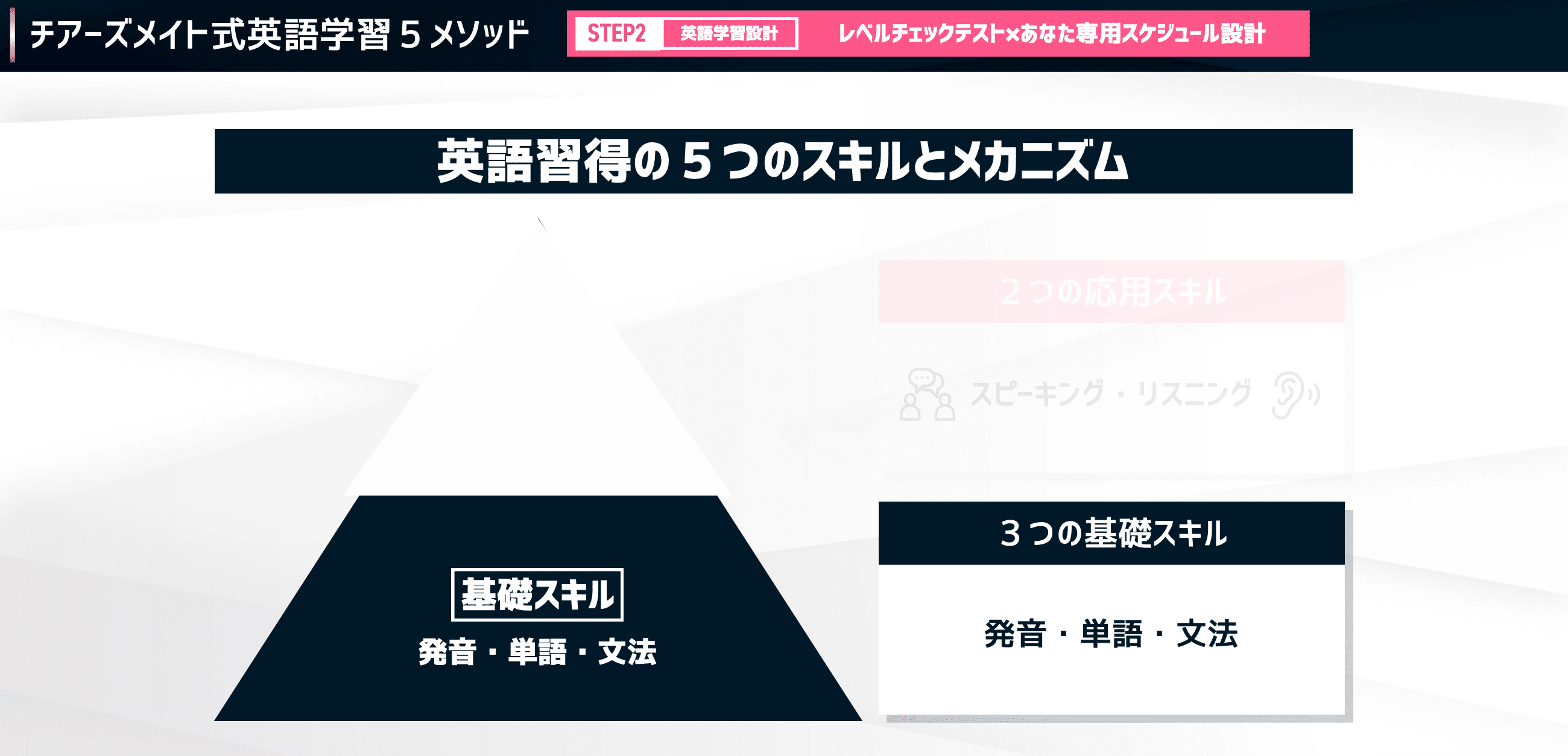 発音・単語・文法っていう基礎の上に応用としてスピーキング・リスニング、これが乗っかっているというようなピラミッド構造になっているんですね。