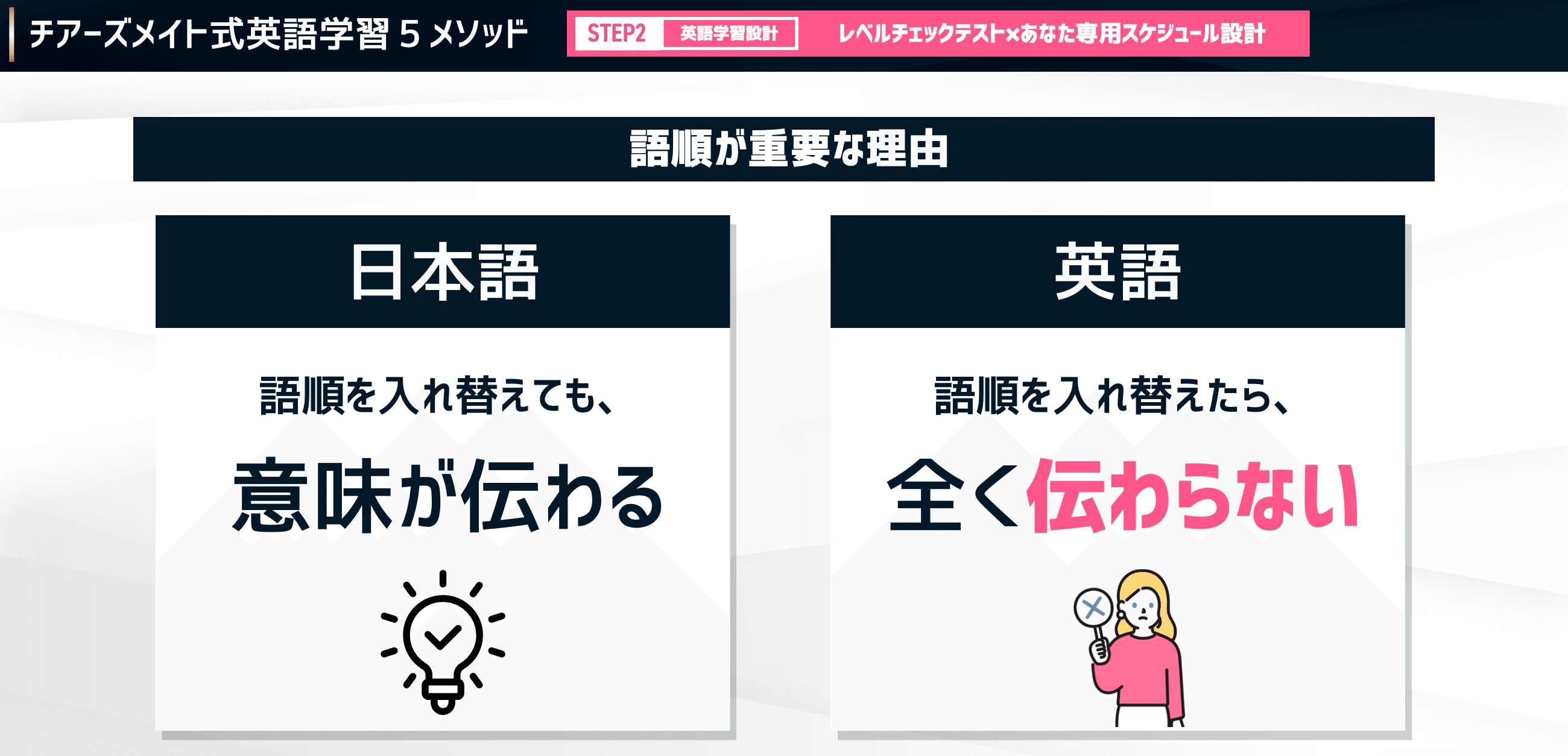 この語順が重要な理由としては、英語と日本語との文法ルールの違いにあるんですね。