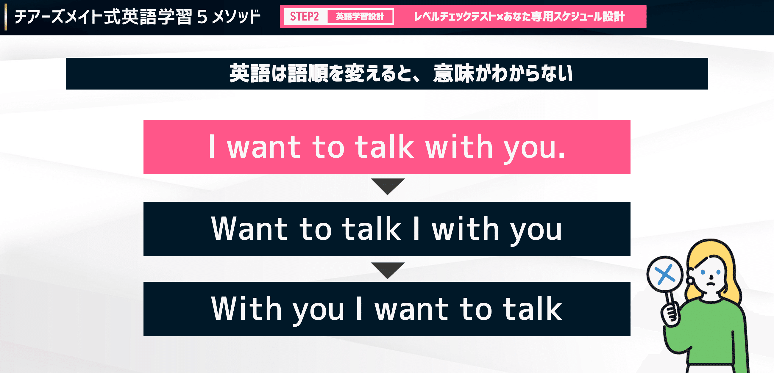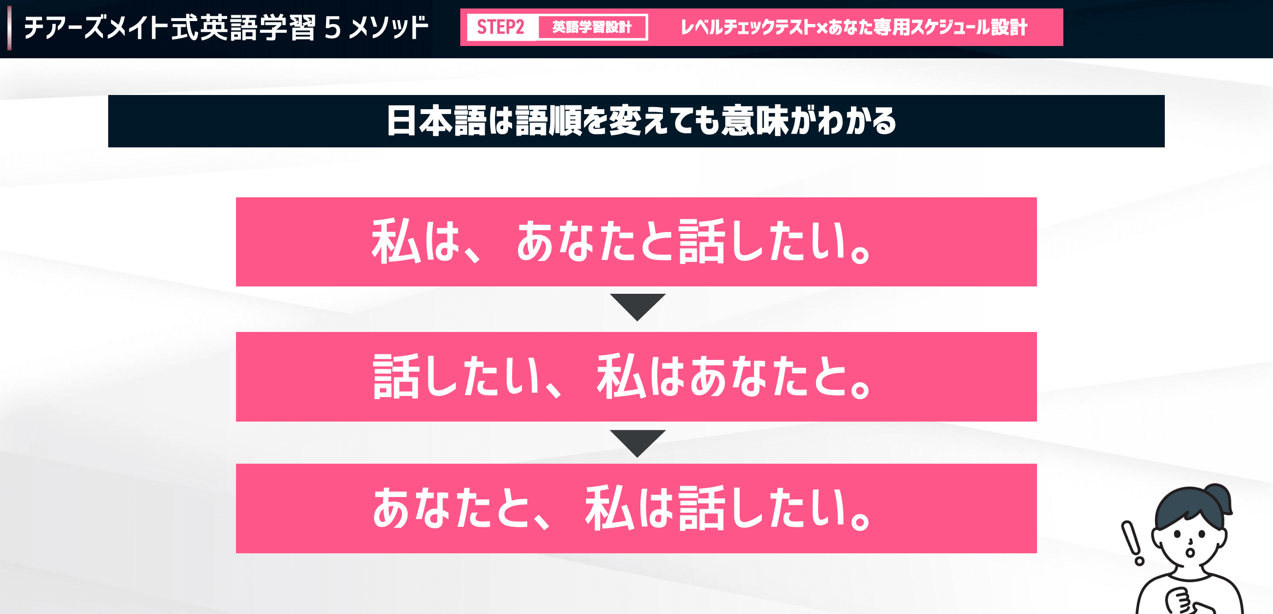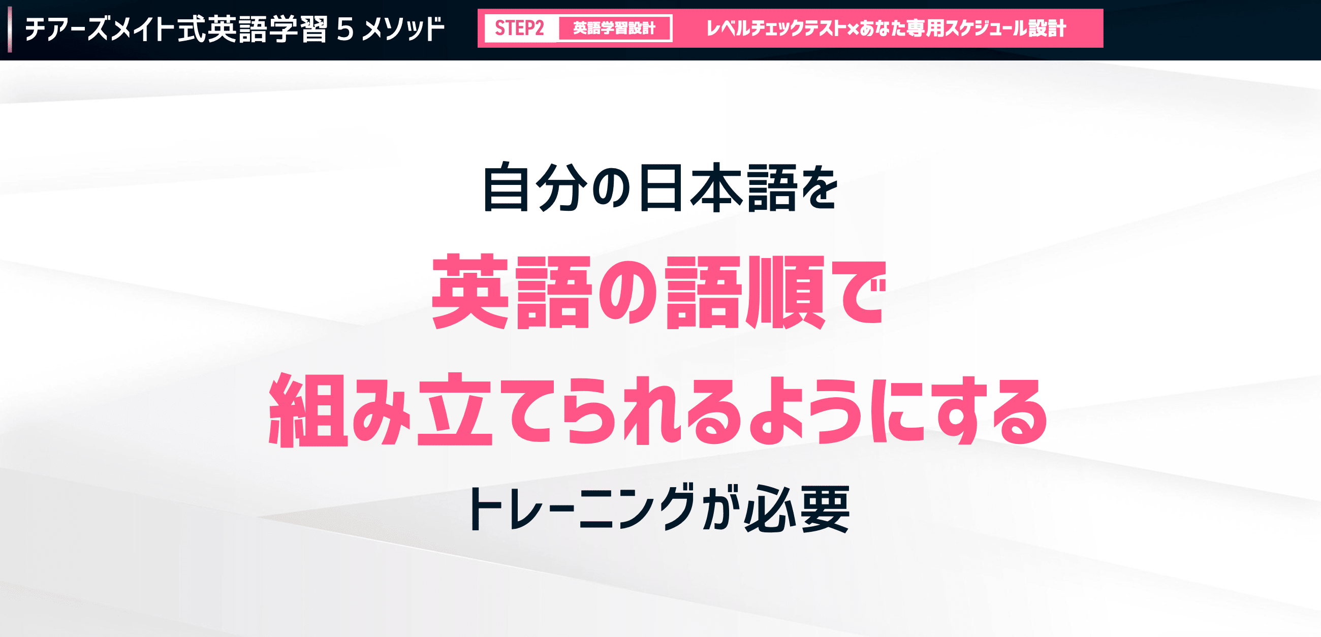 だからこそ、自分の中にある「これを伝えたい」という日本語を、英語の語順に従って組み立てるトレーニングが欠かせません。