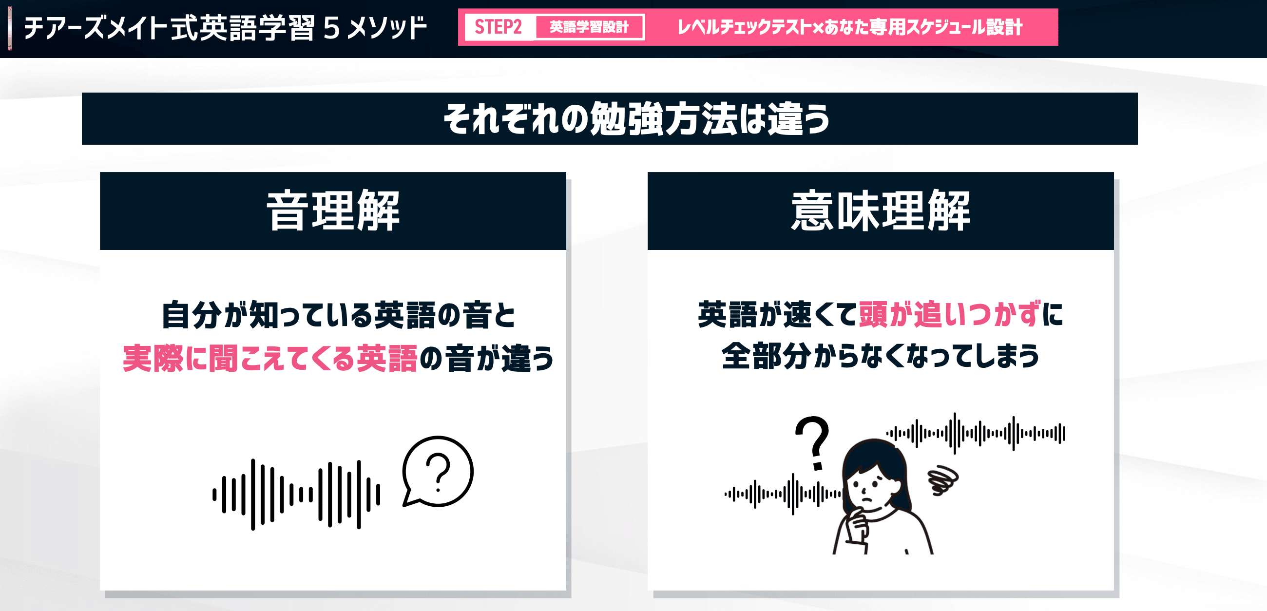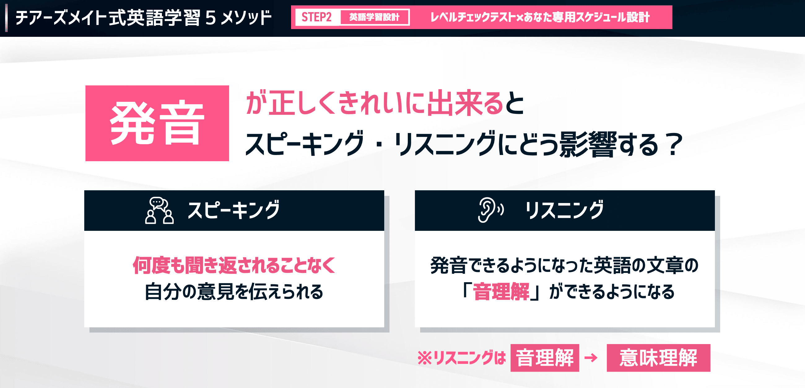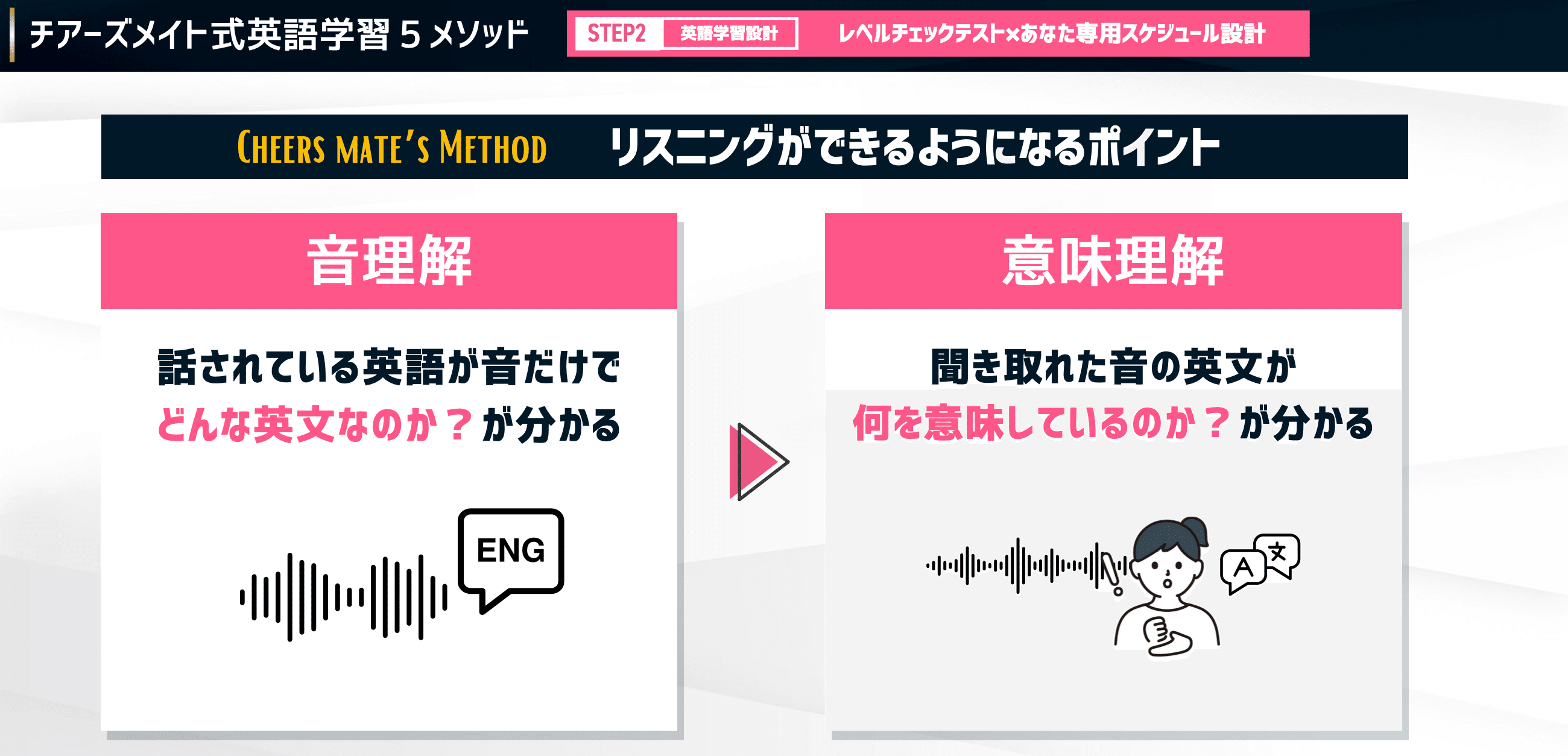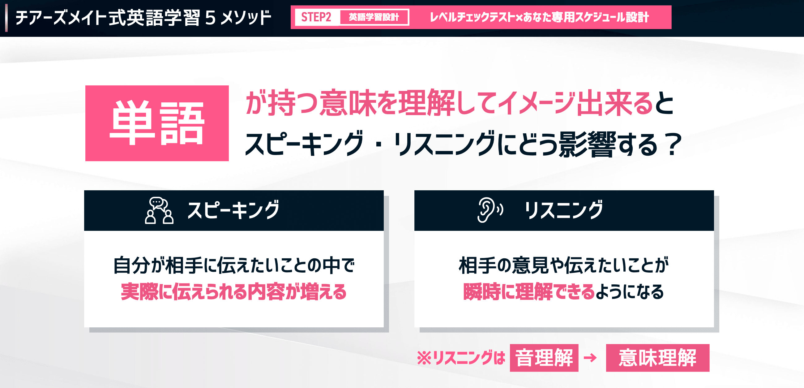 もう一つの応用スキルである「リスニング」を伸ばすためには、2つの力を鍛える必要があります。それが「音理解」と「意味理解」です。