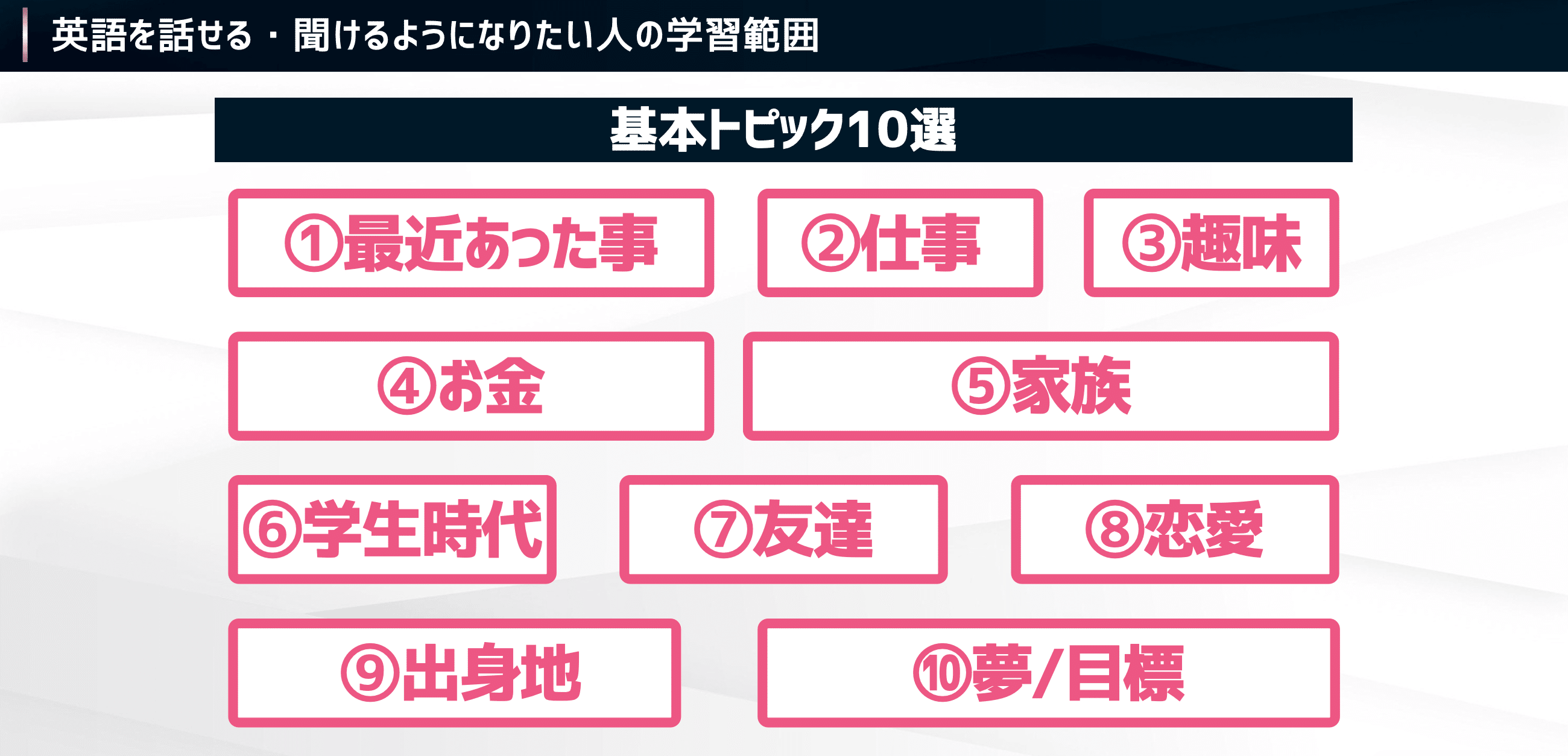 まずは、以下の「基本トピック10選」の中から、あなたが普段よく話す内容を選んでください。