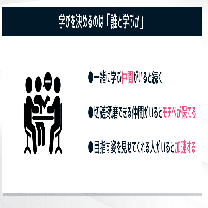 一方で「誰と学ぶか」を意識すると、学びの質は大きく変わります。